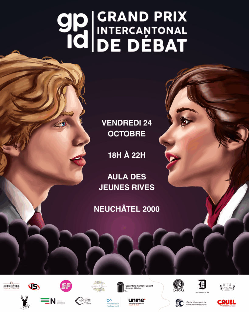 Le GPID est un évènement intercantonal qui oppose les meilleurs orateurs des quatre Cantons universitaire que sont Genève, Vaud, Fribourg et Neuchâtel lors d’un débat un contre un suivi d’une conférence de presse improvisée.