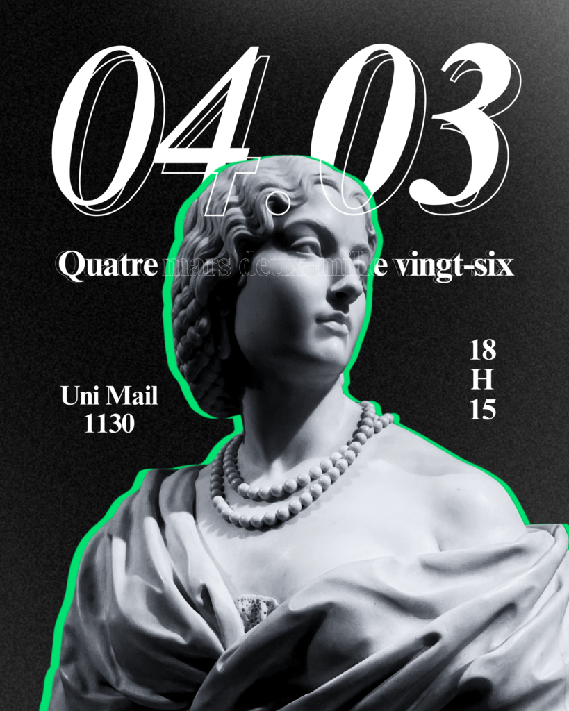 Le vingt-cinq février deux-mille-vingt-six, dès 18h15 en salle 1130, Uni Mail.